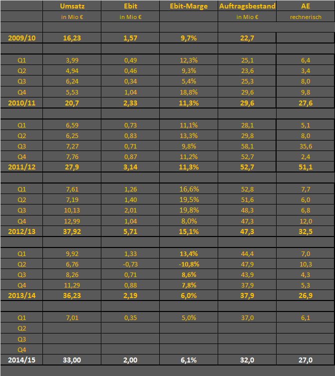 Im Nachhinein muss man wirklich leider sagen, dass LST von den beiden Großaufträgen aus Q3 2011/12 jetzt drei Jahre gut lebte, aber ohne neue Großaufträge bröckelt der Auftragsbestand stückchenweise weg und könnte Ende des Jahres dann wieder auf dem Niveau vor den damaligen Großaufträgen liegen. Das ist insofern ernüchternd, da man ja die Kapazitäten, vor allem beim Personal, erhöht hat, um größere Volumina abwickeln zu können. Jetzt geht das etwas nach hinten los. Man hat nun deutlich niedrigere Margen als in den letzten 5 Jahren.