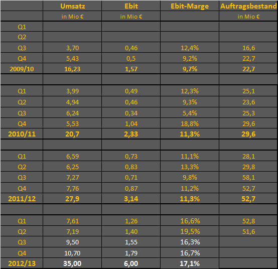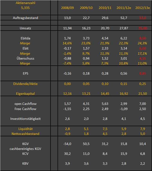 und ich muss sagen, ich bin sehr glücklich mit dem Rücksetzer, dass ich meine Position noch etwas ausbauen kann, warum? Ich sehe das Ganze so: 1. Umsatz keine Diskussion da hätte ich mehr erwartet, ABER LSTelcom ist auch stark Projektabhängig und deshalb können sich die Umsätze unterjährig ins nächste Quartal verschieben. Man kann sich ja den Umsatzsplit genau anschauen. Segment Dienstleistungen +58% Segment Software +38% lediglich System Hardware hat nicht mitgespielt mit -56% ich denke das könnte damit zusammenhängen dass man keine großen Neuprojekte gestartet hat sondern laufende fertig gemacht hat und somit der Hardwareumsatz geringer war. Auch wurde dort ja die Fertigungskapazität erweitert, vlt. hängt es auch damit zusammen. Sorgen würde ich mir erst machen, wenn das Segment generell in den kommenden Quartalen schlecht performt, das schliesse ich aber aus, sonst hätte man dort nicht extra die Fertigungskapazitäten in großem Umfang erweitert. Das Wachstum in den anderen Segmenten war ja wie gesagt bombastisch. 2. EBIT Marge einfach nur der Wahnsinn, was passiert da erst wenn die Umsätze noch stärker anziehen? Man muss auch hier mal auf das system Hardware schauen, trotz dem 50% Rückgang konnte das EBIT da positiv gehaltne werden, was passiert da erst wenn der Umsatz ansteigt----wahsninns Hebel. Auch zu beachten im GB dass die Aufwendungen für externe Dinestlesiter weiter hoch waren, hier besteht auch noch weiteres Opitmierungspotential. Insgesamt kann man nur sagen LS Telcom muss über eine wahnsinnig gute Marktstellung und großes Know How verfügen, andernfalls wäre man nicht in der Lage solche Margen zu erzielen. 3 Steuern, denke das dürfte hauptsächlich ein temporärer Effekt sein, der sich so nicht unbedingt in die Zukunft fort schreiben lässt. Vorstandsaussagen gefallen mir auch dass er schon jetzt für das kommende Jahr Wachstum verspricht und auch bzgl. der nahen Geschäftsentwicklung sher positiv ist, vermutlich bald mal wieder ein Großauftrag? Cash Flow war auch absolut in Ordnung für ein solches Wachstumsunternehmen, trotz starkem Aufbau von Forderungen hatte man einen positiven CF operativ von 2,6 Mio. Fazit: Bei einem Kurs von 8 werde ich massiv wieder kaufen, da die Bewertung ein Witz ist für solch ein Unternehmen, wie man sie ja auf dem deutschen Kurszettel kaum noch findet. Marketcap dann bei rund 40 Mio. Nettocash ca. 5 Mio somit Enterprise Value von 35 Mio. das bei einem EBIT von 6 Mio. und eineme EBITDA von ca. 8-9 Mio. halte ich für lächerlich günstig. Stimme deinem Forecast zu Katjuscha, der dürfte ziemlich perfekt passen. Ohnehin das aktuelle GJ ist ja schon im Septmeber zu ende und im nächsten werden die Zahlen sich weiter verbessern somit ist die Bewertung noch günstiger. Kursziel für mich zunächst einmal 12 Euro. Vermutlich wird es nun aber ne Weile seitwärts gehen, weil einige Leute vom Umsatz enttäuscht sind |