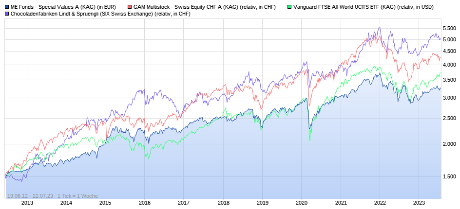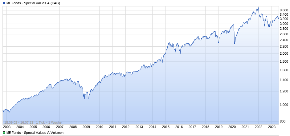 Der ME Fonds – Special Values A (ISIN: LU0150613833) von Dr. Markus Elsässer ist ein flexibler Mischfonds, der auf langfristigen Kapitalzuwachs durch Investitionen in Qualitätsaktien abzielt. Seit seiner Auflage im Juli 2002 erzielte der Fonds eine durchschnittliche jährliche Rendite von über 7 % und verzeichnete nur drei Verlustjahre, wobei der größte Rückgang während der Finanzkrise 2008 bei etwa 15 % lag .(fondsdiscount.de, dasinvestment.com)