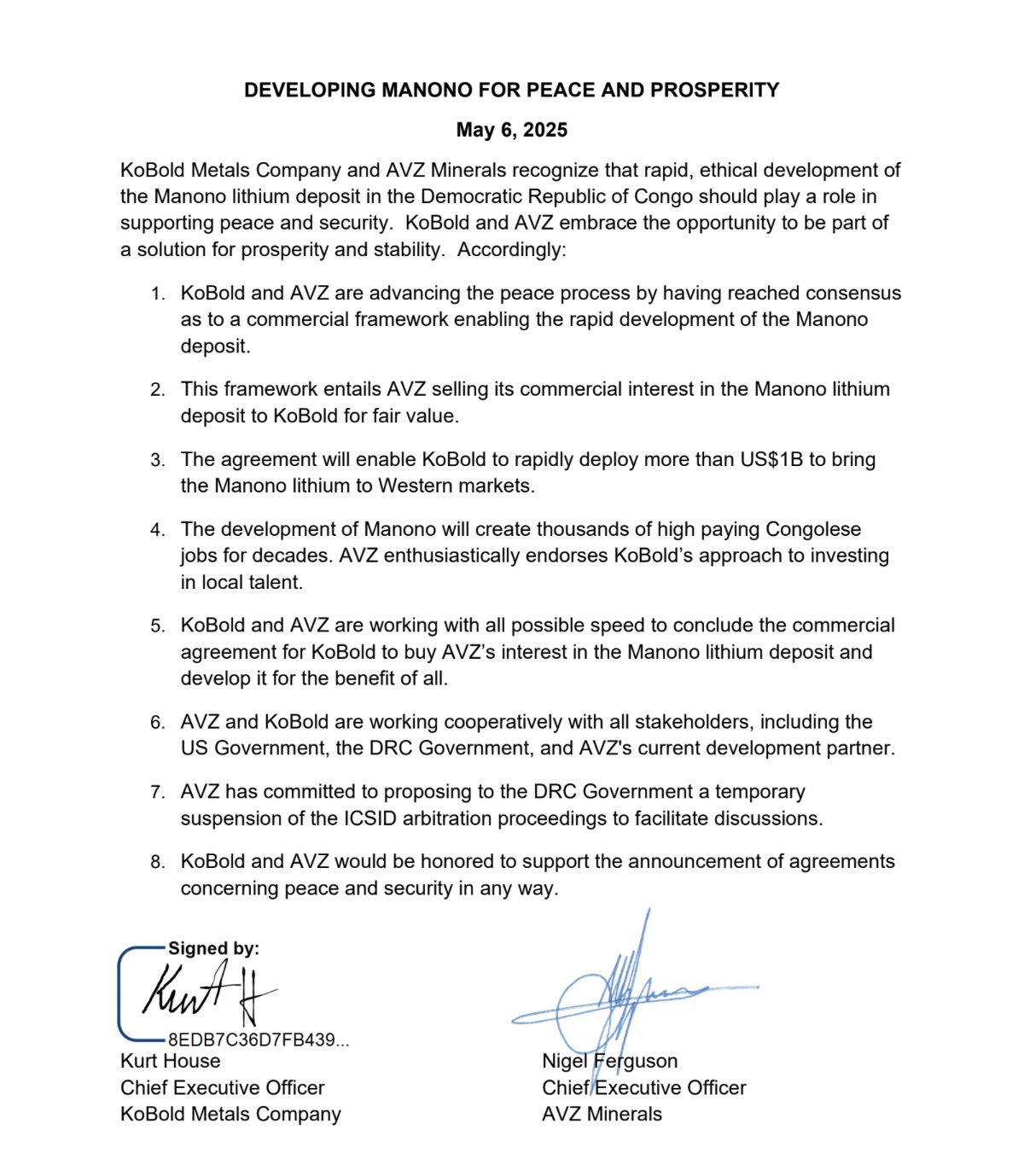 KoBold said that to advance the plan AVZ would need to receive “appropriate compensation” and agree to transfer all its interests in Congo. Once all disputes are resolved, Zijin would keep the northern section of the deposit, and the US company would develop the southern portion.