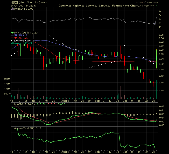 HealthSonix (HSXI) has initially (and we believe temporarily) struggled to gain traction following an announcement that the company and Abbott Laboratories would launch an innovative combination therapy program for patients with advanced rheumatoid arthritis. As we all know, one of the most significant and opportunistic PR's any company can release is one that contains an association with a household name. (in this case Abbott Laboratories). Not only does the company announcing the major PR get the chance to excite it's current shareholders with a potentially huge new development but it also gets the unique opportunity to create exposure for itself among the shareholders of the household name company. Two for the price of one so to speak. In our opinion one reason this highly anticipated union seems off to a bit of a slow start is because the program is only commencing in Southern Ontario. So give it some time. Think of it this way; What if one of the largest auto makers in the world suddenly created an association with a much smaller auto maker. What would an investor expect the share price of the smaller company to do as a result? Therefore, The Green Baron Report still believes HealthSonix has a focused plan that involves significant and increased marketing initiatives as well as exciting new collaborations.