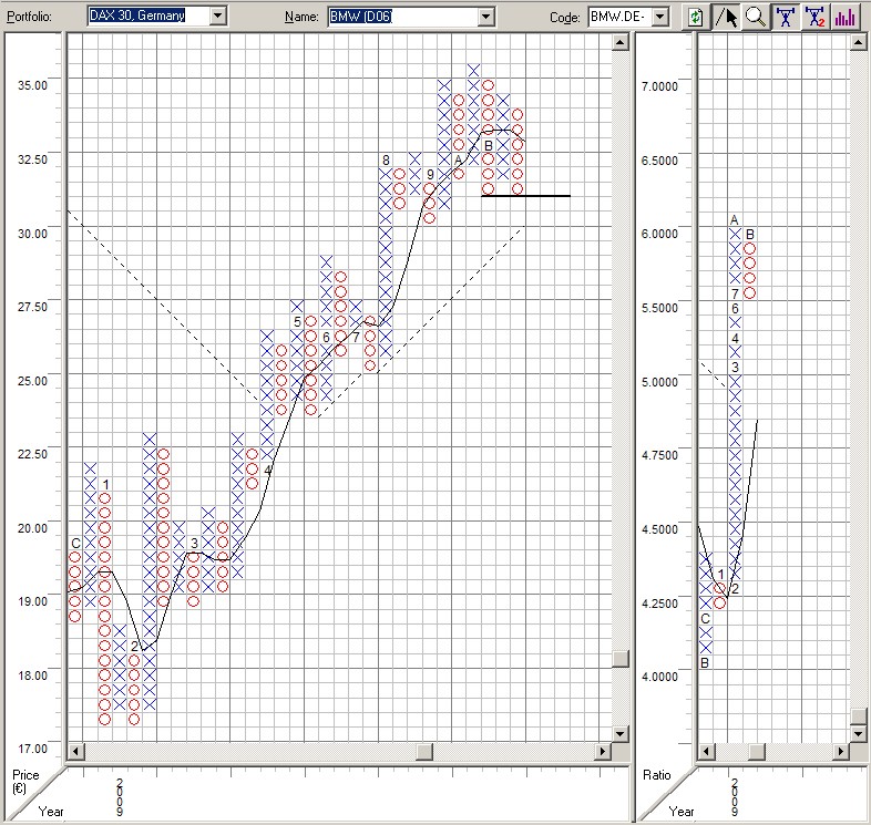 Der Chart auf der rechten Seite zeigt die Relative Stärke der BMW-Aktie zum DAX-Gesamtmarkt in der Monatsbetrachtung. Hier zeigt sich, dass sich die Aktie erst seit November 2009 schlechter als der Gesamtmarkt bewegt - aber die ersten 10 Monate 2009 deutlich besser lag als der Gesamtmarkt.