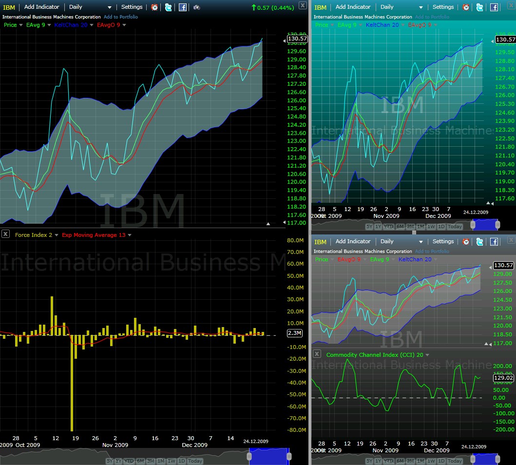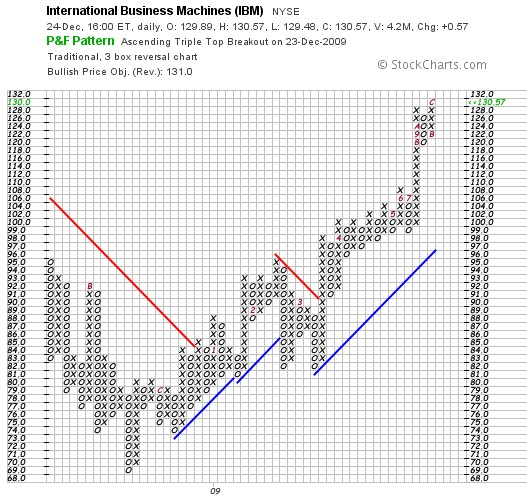 Auch charttechnisch zeigte die IBM am 23.12.2009 einen "breakout of a triple top". Ein solches Chartsignal gilt als eines der zuverlässigsten mit einer Profitability Rate von 87,9 %. Wie in dem vorstehenden Artikel ausgeführt, erholte sich die Aktie von ihrem Jahrestief von 79,68 USS auf das gegenwärtige Jahreshoch von 130 USS. Mit dem neuerlichen Ausbruch aus dem triple top können weitere Kursanstiege erwartet werden.