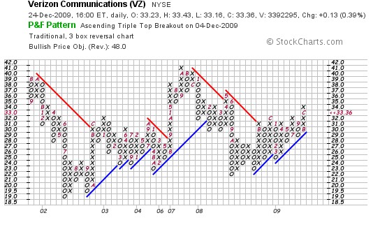 Bei Verizon Communications Inc (Dow Jones Wert) gab es am 04.12.2009 einen solchen Ausbruch aus einem Triple-Top. Die Aktie ist seitdem um 1,53% gestiegen, das entspricht bei einer Anlagedauer von 21 Tagen einer Rendite von 26,21%.