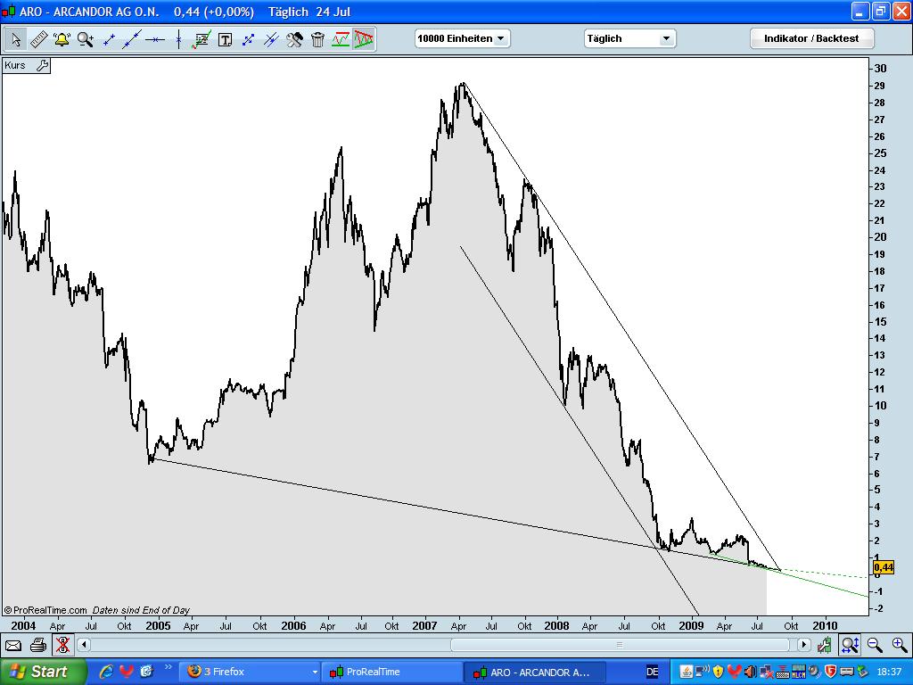 Die Aktie von Arcandor notiert aktuell knapp über dem Ab - Trend der als SP im Bereich 0,41 gilt. Dieser ist durchaus stabil, eine interessante Position im Chart gerade: Es läuft alles in ein weites Dreieck, im besten Fall wären sogar nochmal 0,82 möglich! Der Bereich um 0,42 bietet sich knapp überm Trend zum Kauf an, ein Stop im Bereich 0,35 ist ratenswert, das Ziel beträgt vorerst 0,53, kann aber uU auf 0,63 bis 0,71 ausgeweitet werden..... das CRV ist attraktiv, jedoch ist solch ein Invest nur etwas für risikofreudige Anleger, der SL sollte strikt eingehalten werden, ansonsten bietet sich hier gerade eine gute Chance: