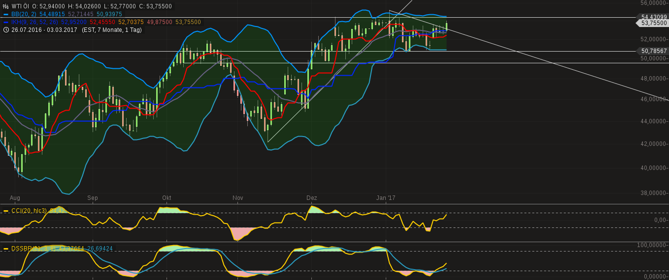 Beim WTI sagte ich ja zwischen 40-60$ alles andere wirkt den Motor ab - zwecks Weltkonjunktur! Wenn wir darüber landen sollten und das Nachhaltig, dann ist es wieder ein Fest für die Zocker und der Kleinanleger hat das Nachsehen. :-) Was mich stört ist der Tageschartverlauf vom Dezember letzten Jahres, ganz vorn knapp am Anfang bemerkenswerte Dochte was folgt, ein kleiner Buckel und meines Erachtens eher in Richtung Downer. Ansonsten 65$ -70$ heiße Phase, um nach oben auszubrechen. Die 50$ müssten mit den Downer drinnen sein, beim unterschreiten, wieder in Richtung 40$. |