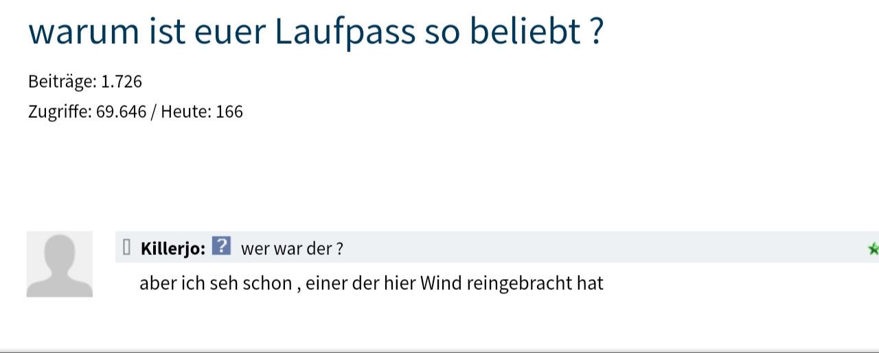 | eröffnet am: | 04.06.20 14:30 von: | Laufpass.com | Anzahl Beiträge: | 1826 |