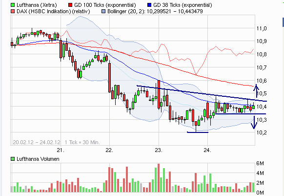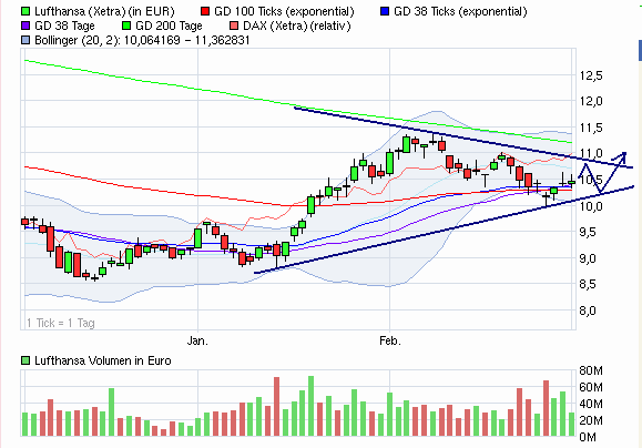 Unter Berücksichtigung des Gesamtbildes dürfte sich ein Dreieck bilden. Zusammen laufen aus Abwärtstrend und Aufwärtstrend. Aufgrund der grundsätzlichen positiven Einstellung zur Lufthansa gehe ich (ohne politische Börse) mal dreist von einem Ausbruch am Ende nach ob aus....