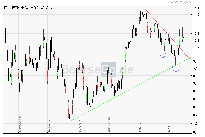 16.03.2012 (www.4investors.de) - Seit Mittwoch versucht die Aktie der Lufthansa, die kleine charttechnische Hindernismarke bei 10,62 Euro zu überwinden. Im Handelsverlauf hat das zwar sowohl am Mittwoch als auch am Donnerstag geklappt, aber die Breaks haben sich bisher auf Schlusskursbasis nicht bestätigt. Als Folge darauf hat sich die Widerstandszone bis auf 10,72 Euro ausgedehnt.