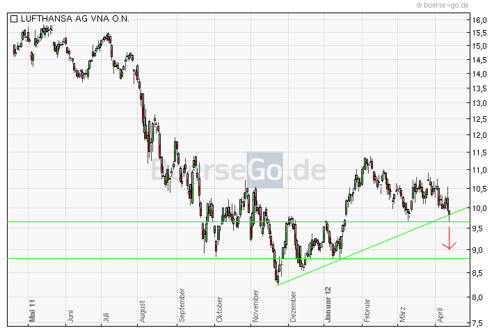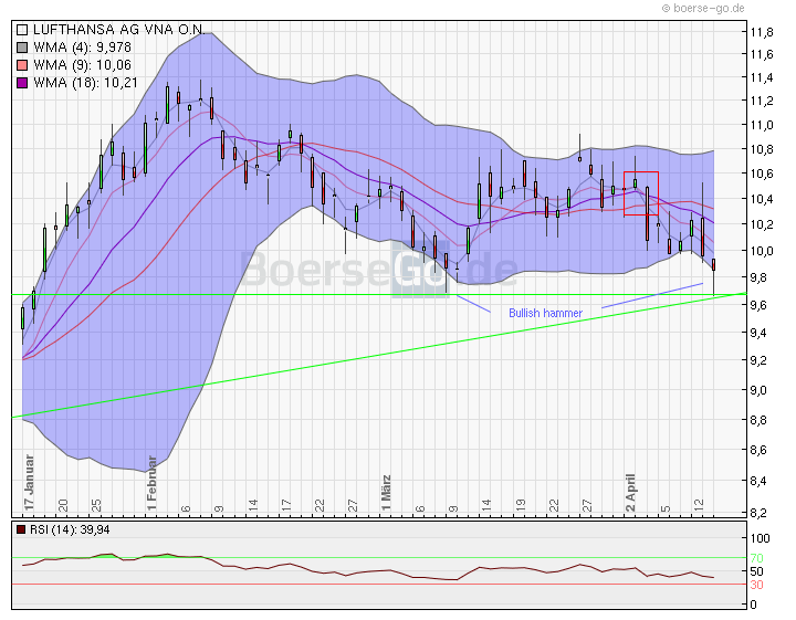 Prognose: weiterhin schwierig. Ein Einstieg auf dem Tief war heute durchaus sinnvoll (ärgerlich um den SL, was solls...), da Kauf analytisch begründbar gewesen ist. Der bullish hammer wäre erst mit Bestätigung am Folgetag (also Morgen) zum SK ein Kaufsignal. Der Stop muss dann jedoch folglich unter der heutigen gesetzt werden. Viel Platz ist jedoch nicht nach oben, da wir uns in einem Abwärtstrend befinden. Der Deckel wartet auf dem gestrigen Hoch bei 10,525. Ein Bruch dieser Marke wird intraday Kaufsignale auslösen. Defakto muss egal ob LH diese Marke nun direkt nimmt oder nicht, ein Zwischenhoch für einen neuen Aufwärtstrend generiert werden. Alternativ kehrt sie nach kurzem Anstieg auf die heutige Unterstützungslinie zurück um dann die 10,525 in Angriff zu nehmen. Ein weiterer Einstieg wäre möglich, sollte sich morgen ein Innenstab abzeichnen, da die Unterstützungstrendlinie und Bollinger Band begrenzend wirken werden. Stop auch dann unter dem heutigen Tief. Nach 1-2-3 liegt selbstverständlich noch KEIN Kaufsignal vor. Insofern durchwachsene Situation... |
