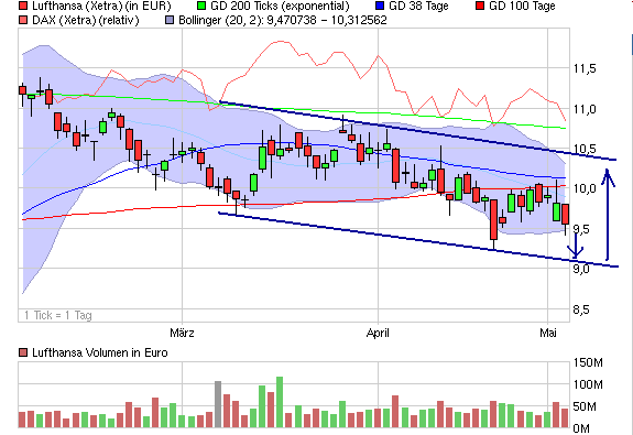Heute war eigentlich ein guter Tag für LH (sorry an alle die seit gestern ggf. bereits mit 5,5% im Minus sind :-) ). So eine Art "reinigendes Gewitter", da auch Entscheidungsdruck für den weiteren Verlauf aus der marktechnischen Sicht zugenommen hat. Reagiert der Gesamtmarkt am Montag negativ auf die Wahlen vom Sonntag und haben wir am Mittwoch den Divi-Abschlag, haben wir ruck zuck die Bestätigung des übergeordneten Abwartstrends und dann in Kürze die Kurse bei bzw. unter 9. Dann wird eingekauft. Reagiert der Markt positiv, haben wir eine aktuell eine Chance auf die Ausbildung eines schönen Aufwärtstrends (den Ausreißer am 26.04. ignoriere ich mal). Schafft LH dann über 10,20, würde ich ebenfalls über einen Einstieg nachdenken. Die Situation ist heute wie vor ein paar Wochen am 20.04.2012, spannend.