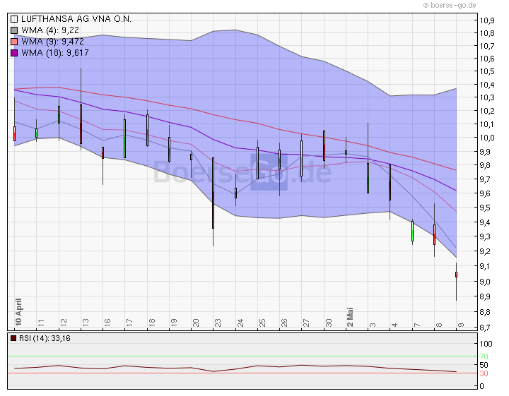 Bei Lufthansa fiel die letzten Tage auf, dass die Höchstkurse täglich niedriger wurden. Ich hatte bei der Deutschen Bank vor zwei Jahren mal ein ähnliches Szenario bei 40 Euro, danach gab es eine Rutsche bis 35,50. Diese Einschätzung lässt zwar keinen Automatismus zu, aber ein gebranntes Kind scheut das Feuer...