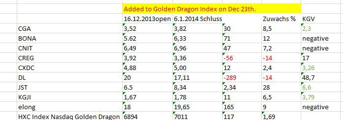 Indexfonds die den Nasdaq Dragon als Referenz haben, müssen den exakt abbilden und bei den managed Fonds hoffe ich das die einen besonderen Focus auf die Werte mit besonders günstiger Bewertung legen. In der Tabelle oben kannst Du sehen das alle Kandidaten die aufgenommen wurden einen sehr beachtlichen Anstieg binnen 12 Monaten hingelegt haben. Wenn CGA nur eine durchschnittliche Bewertung bekomt, dann ist eine verfünfachung durchaus denkbar.
