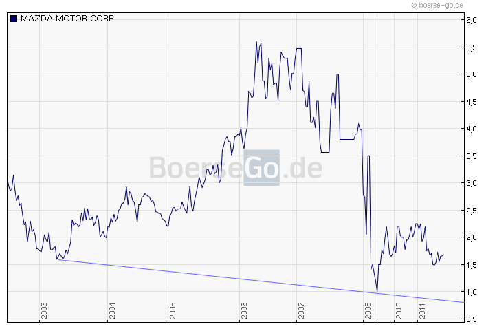der festen Überzeugung, dass es genau jetzt richtig ist einzusteigen. Ich habe die erste Tranche bei 1,33 erworben die Zweite bei 1,19 1., der Kurs ist tief 2., 15.000 Vorbestellungen vom CX5 in Europa 3., angepeilt für dieses Jahr 160.000 CX-5, davon 40.000 in Europa ( wird wohl übertroffen werden ) 4., Preis Leistung stimmt endlich wieder 5., 1., Serienfahrzeug mit Euro 6 6., erste Verkaufszahlen in Österreich sprechen klare Worte. In 1 Woche 750 CX-5 verkauft 7., Mazda 6 voraussichtlich mit 147KW 200 PS mit nur 3,8l Verbrauch 8., voraussichtlich wird die 1. Million schneller erzielt wie bei der ersten Gen. des Mazda 6 9., alle 7 Monate ein neues Modell ( nach dem 6er folgt der 3er mit Hybrid ) 10., Geldfresser sind weg, wie z.b. die Produktion des teuren Wankel. ( Schade bin auch Wankelfan ) ich persönlich sehe die Aktie mittelfristig bei einem Kursziel von 2,0 bis 3,5. |