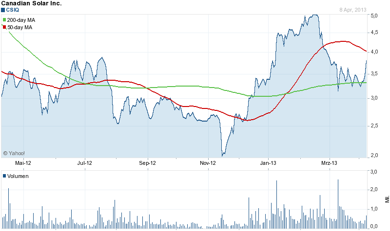 Aber auch sehr schön die Entwicklung von Canadian Solar, die heute sogar zurück uber die 50-MA gesprungen sind und ein sehr gesundes Chartbild gehalten haben, nachdem Suntech, Trina, Yingli und Co ziemlich abgeschmiert waren. Ich nehme an, das liegt am vergleichsweise weit entwickelten Projektgeschäft.