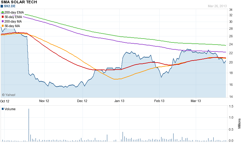 SMA hat heute den geschäftsbericht für 2012 veröffentlicht. Die Zahlen waren in den wesentlichen Zügen bereits bekannt. Das Unternehmen war in 2012 noch hoch proffitabel, wenn man es mit anderen Solarwerten vergleicht. Auch die Dividende von 0,60 Euro entspricht beim aktuellen Kurs noch einer Dividendenrendite von ca 3,4%.