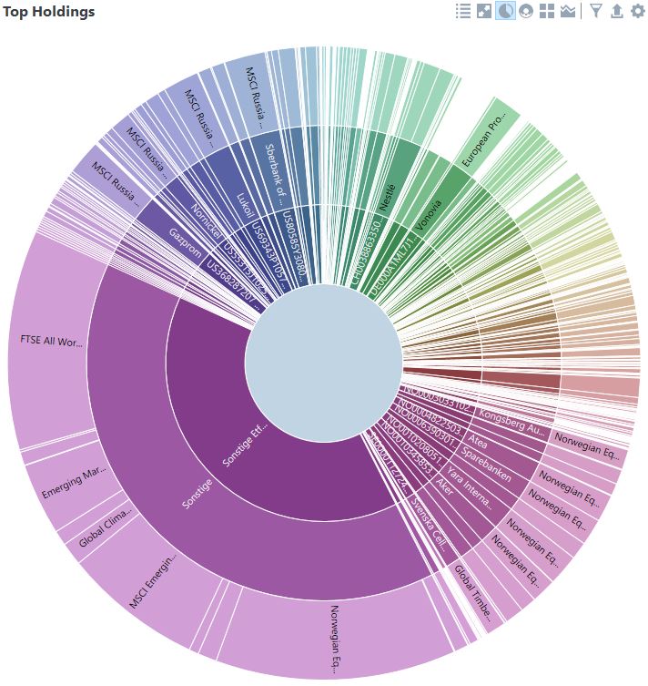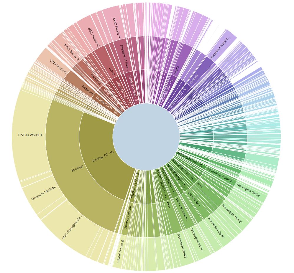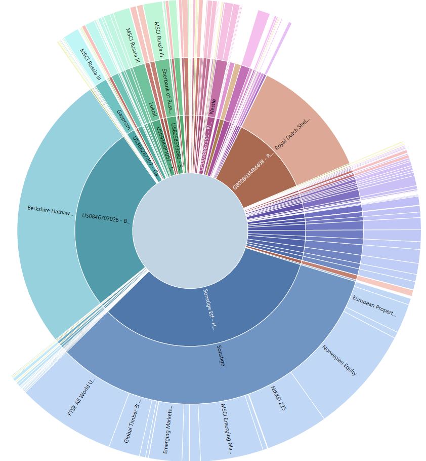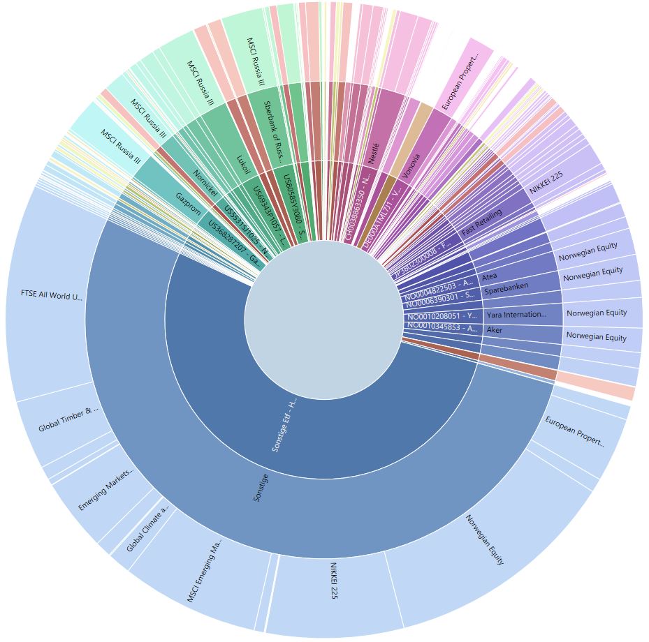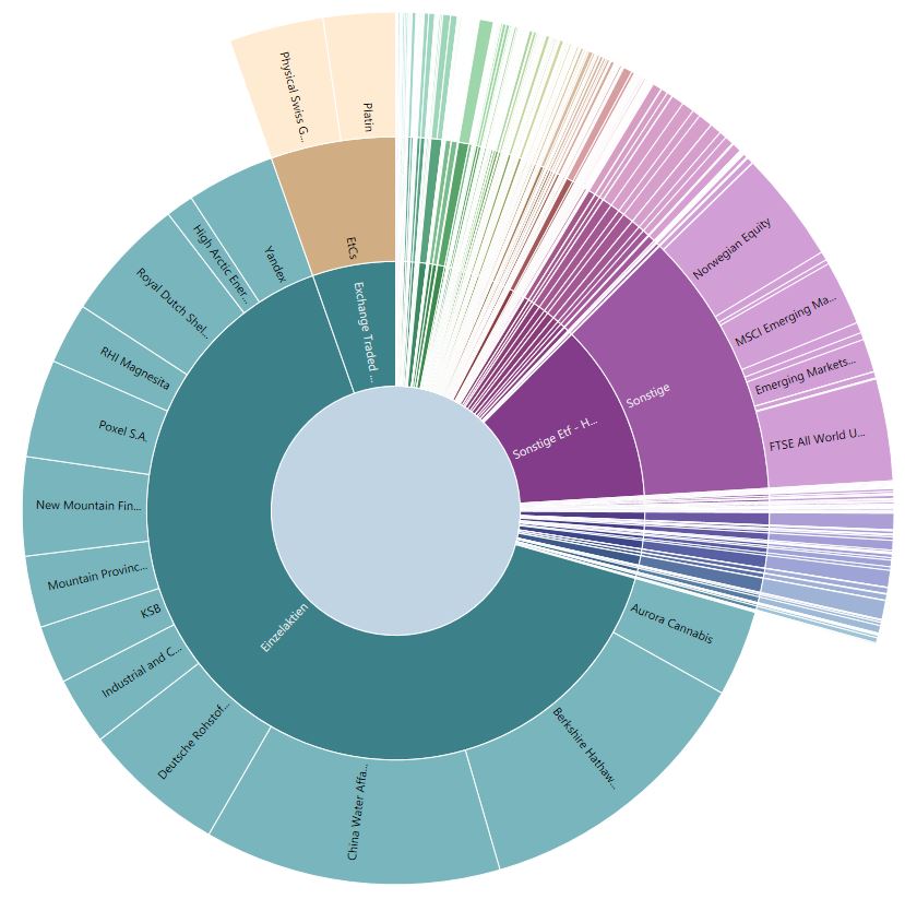 Leider sind nicht alle Emittenten so transparent diesbezüglich wie Black Rock, geschweige denn so praktisch. Bei Nordea beispielsweise werde ich den letzten Halbjahresbericht hernehmen und mir mühsam die ISINs zusammensuchen müssen, um auch die Top Holdings für die Etfs Norwegian Equity bzw. Global Climate and Environment weiter aufdröseln zu können. Bei Vanguard gab es zwar eine Excel-Liste, aber auch hier fehlen sowohl WKNs als auch ISINS. Das wird also noch ein wenig Zeit in Anspruch nehmen, aber ich hoffe, nachstehende Grafik auf Dauer noch deutlich detaillierter hinzubekommen.