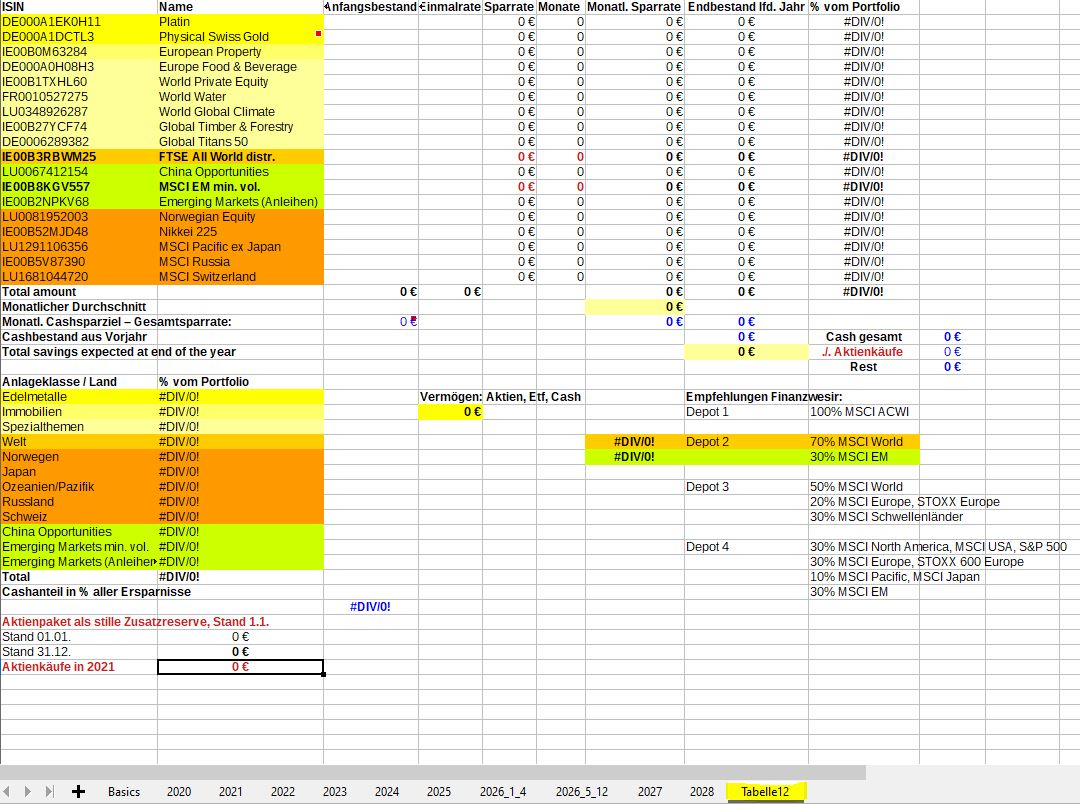 Auch war im Hintergrund ein gewisser Aufwand erforderlich. Um die Sparraten zu berechnen, die für das Erreichen dieser Verteilung einzusetzen sind, legte ich mir eine MS Excel-Tabelle an, wie nachstehend abgebildet (das Sheet "Tabelle 12" gehört normalerweise nicht dazu und wurde nur für diesen Beitrag hier erstellt, damit ich ihn ohne Zahlen posten kann). Die Sheets sind miteinander verknüpft, so dass man beispielsweise die Auswirkung einer geänderten Sparrate ab 2021 auf die Gesamtverteilung im Zieljahr 2026 (oder auch in jedem anderen Sheet) sofort sehen kann.