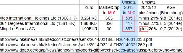 ... hat --nach bestandsreduktion-- am 11.04. Mingle-aktien in großem stil zurückgekauft, vernünftigerweise zu kursen unter 2 €; sein Mingle-bestand liegt wieder bei fast 24.000 stk (durchschnittlicher erwerbskurs €2,17) http://www.wikifolio.com/de/...t=bfc1048a-b2c0-47dd-a518-d1d046c58ccf sein kommentar: "KUV unter 0,1, KGV unter 1. KBV unter 0,2. 22 von 26 Vertriebsdistributoren konnten vom zurückgetretenen Wirtschaftsprüfer auf Anhieb verifiziert werden. Selbst wenn nur 50 % des Geschäftes existieren sollte, wäre die Aktie noch immer sehr günstig. Aber dass überhaupt etwas nicht stimmt in der Buchhaltung der Firma, dafür gibt es bis heute keine Beweise - nur eine Vermutung des zurückgetretenen Wirtschaftsprüfers, nachdem dieser aber die Jahresabschlüsse von 2009, 2010, 2011 und 2012 ohne Einwand als der Wahrheit entsprechend testiert hat." "Die Börsenbewertung der Aktie nimmt Ausmaße an, wie ich sie noch nie in fast 20 Jahren Börsenbefassung gesehen habe. Selbst in den Finanzkrise 2008/2009 habe ich so etwas nicht gesehen. Per 31.12.2012 hatte die AG umgerechnet 89 Mio. Euro Cash verbucht - vom Wirtschaftsprüfer testiert. Auch per 31.12.2013 gab es nach der Ad-hoc vom 20.03.2014 dagegen keine Einwände. Börsenwert aktuell nur ein Drittel des Nettocash - von den sonstigen Vermögenswerte gar nicht zu schreiben." |