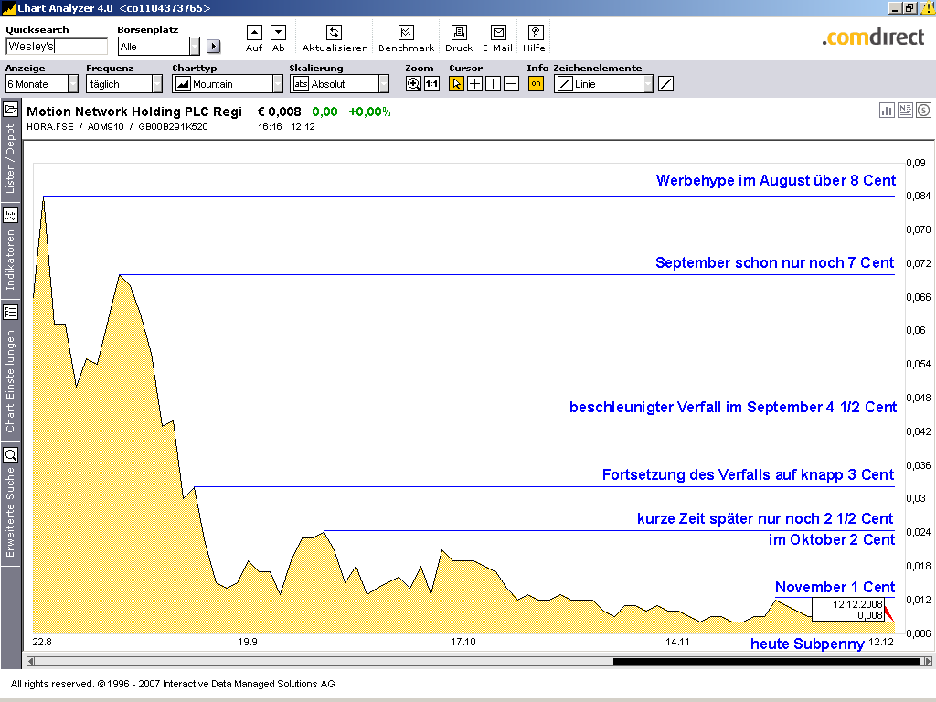 Dass mich der Kurs abfuckt, gebe ich natürlich unumwunden zu, aber letztendlich zählen folgende Daten: 01.04.08 = Entry Standard, 31.12.09 = Jahresergebis 2009 mit ersten Einnahmen und 01.04.10 = Dividende