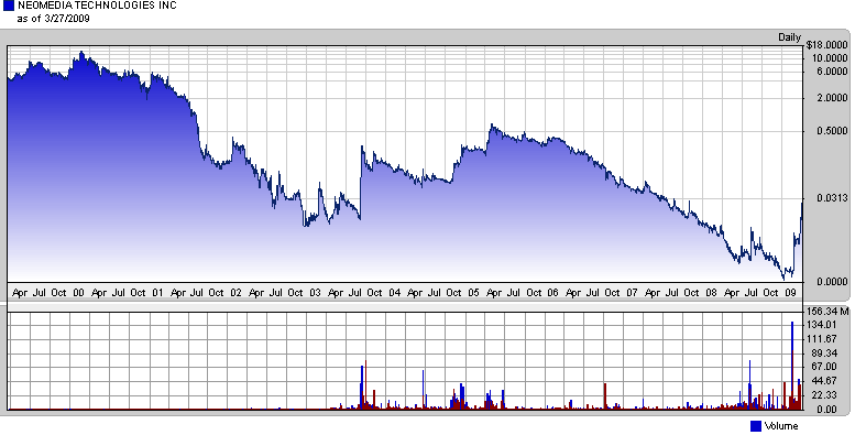Regarding Neo Media, the recent move up is a result of several factors. NEOM stock first starting to move (from around .0015) on the news of a patent re-exam by the US Patent office. Their patents were reaffirmed and that news started things moving. The more recent move is due to anticpation of good news being announced during the upcoming conference call on April 8th. NEOM shareholders are also anticipating good news regarding the lawsuit NEOM (plaintiff) has filed against ScanBuy for patent infringement. There is a prelimary hearing on this issue soon (I believe April 7th) and shareholders are hoping for good news. Shareholder's are looking for a good week ahead for positive developements within the company which should also translate to a higher stock price. jmho
