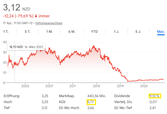 Für einen Anleger, der einen kleinen, marktengen, strukturell riskanten, aber cashflow-starken Turnaround-/Dividendenwert bewusst sucht, ist Sky noch investierbar. Auf Kursen um NZ$3,12 entspräche die bestätigte Mindestdividende von 30 Cent grob einer Rendite von rund 9,6 %. Das ist attraktiv – aber genau deshalb auch kein risikoloser Ertrag, sondern die Bezahlung für echte Geschäftsmodellrisiken. (Intelligent Investor)