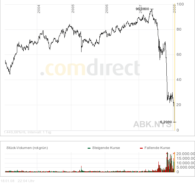 Insofern mein neum eröffnetes konto bei E*Trade nachst woche steht,will ich in Ambac einsteigen! Das ist beschlossene Sache! Habe mir die Zahlen vonm ambac angeschaut und verstehe die chapter 11 Gerüchte überhaupt nicht.Es ist doch aus meiner sicht alles im lot bei Ambac: 700 Mio.Cash ,beinahe 700 mio EBITA-Gewinn in 2007! O.K. 1,8 MRD Schulden und der mögliche downgrade von "AAA" stehen im Raum! Aber sind das wirklich 2 so dramatische Gründe,um nicht in die Aktie einzusteigen ? Ich denke nicht ....