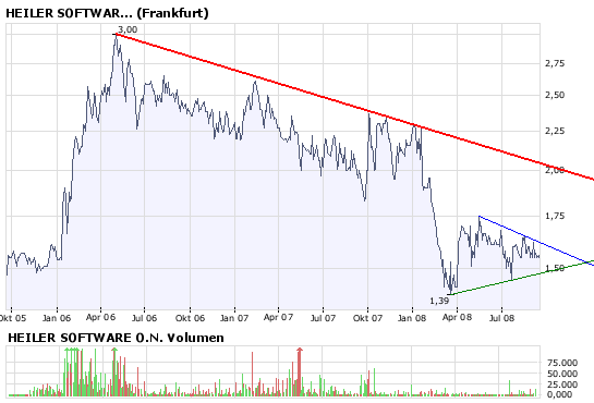1. Heiler Software wäre aktuell mein Favorit. Heiler hat neben dem Cashberg zusätzlich ein relativ niedriges KGV, notiert leicht unter Buchwert und vor allem wächst man mit 30% beim Umsatz und hat starke Skaleneffekte. Der Vorstand ist auch fürs Geschäftsjahr 2008/09 sehr optimistisch stark zu wachsen, und wer sich die Kostensturktur angeht, weiß, was das für die Gewinne bedeutet. Heiler könnte man eigentlich auch ohne den Cashberg kaufen. Der kommt sozusagen nur als Schmankerl oben drauf und er wird weiter anwachsen.