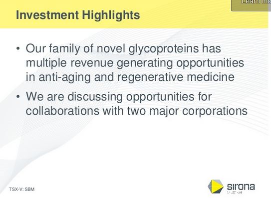 Vancouver, British Columbia – September 30, 2015 – Sirona Biochem Corp. (TSX-V: SBM) (Frankfurt/Xetra®: ZSB) today provides an investor presentation and update.