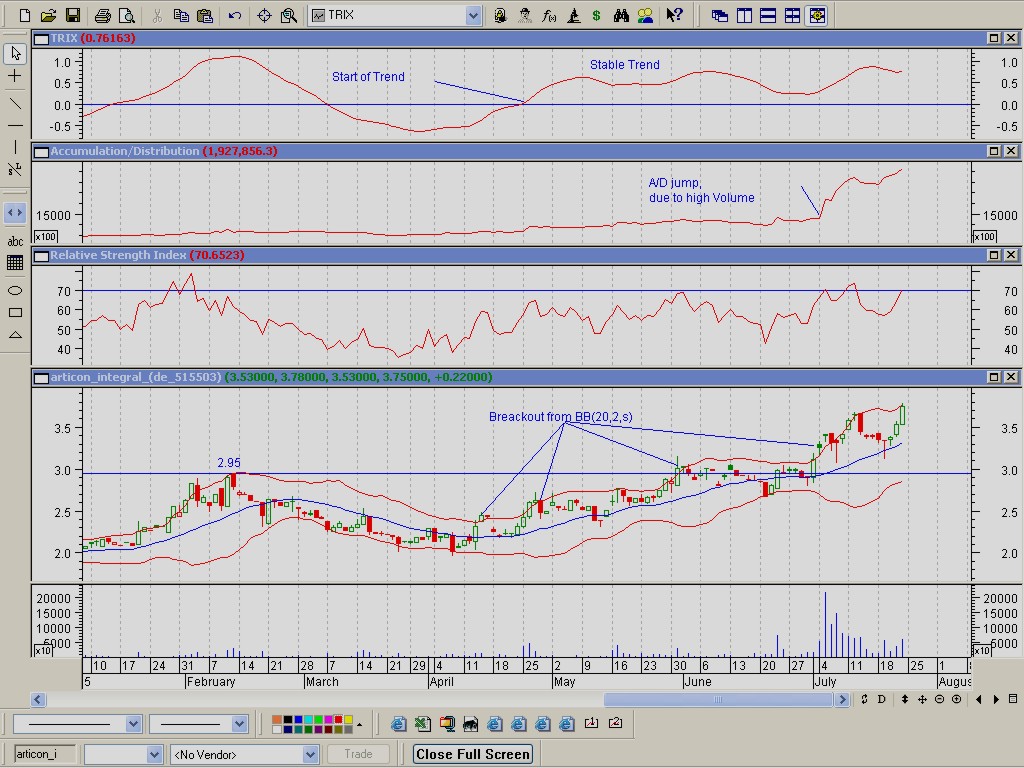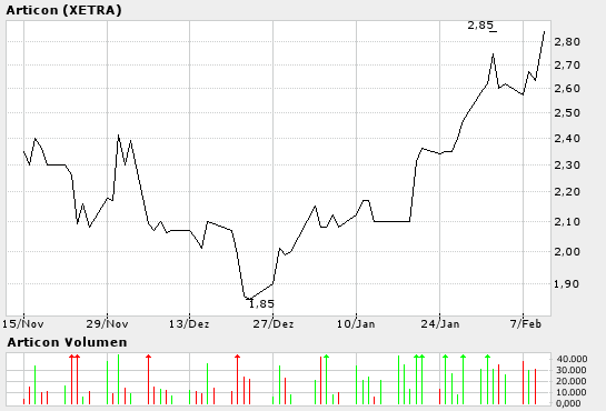 Die "Euro am Sonntag" hat in ihrer gestrigen Ausgabe Articon Integralis als klaren Kauf bezeichnet. Erfahrungsgemäß bewirkt solch eine eindeutige Empfehlung, dass der Kurs zwischen 8 und 12 % in einer Woche macht (in der letzten Zeit z.B. so gelaufen bei Allgeier Holding, Inticom) oder gar völlig durch die Decke geht (letzten Montag z.B. Vivacon aufgrund der EuramS-Empfehlung vom Vortag). Ich habe mir mal einige Stücke zu 3,70 Euro ins Depot gelegt. Schaun mer mal.