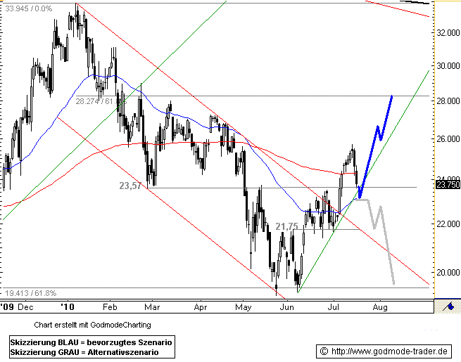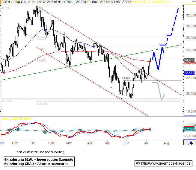 Rückblick: In dieser Woche gelang es den Käufern in der Roth + Rau Aktie endlich, sich an der mittelfristigen Abwärtstrendlinie durchzusetzen und diese nachhaltig nach oben zu durchbrechen. Damit zeigt sich in der Aktie nun wieder ein bullisches Kaufsignal, welches nun im Bereich von ca. 25,90 Euro auf einen nächsten Widerstand trifft. Hier liegt die alten Aufwärtstrendlinie, die Anfang Mai nach unten durchbrochen wurde und zu einer Verkaufswelle bis auf 19,10 Euro und damit bis auf das 61iger Retracement des 2009er Bullenmarktes geführt hat.