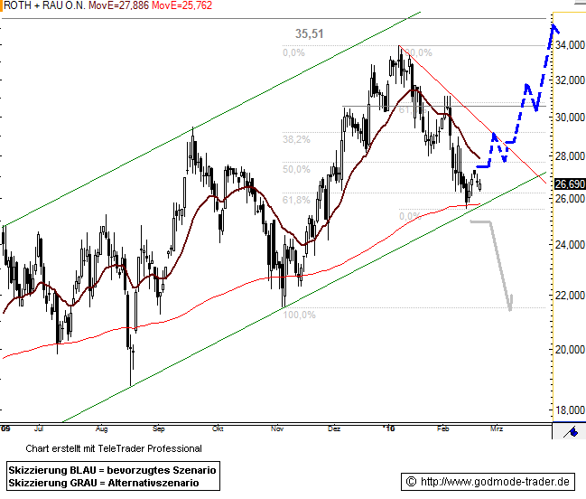 Stock-World Redaktion – Bei der Aktie von Roth & Rau könnte ein interessanter Montagshandel bevor stehen. Der Aktienkurs des Solarenergie-Unternehmens ist am Freitag um rund 5 Prozent geklettert. Der Anstieg hat ein kleines prozyklisches Kaufsignal hervor gebracht, entstanden durch den Anstieg über die Trading -Hürde bei 27,30 Euro. Das kleine Signal vom Freitag könnte aber noch größere Auswirkungen haben: Möglicherweise wurde damit eine Trendwende abgeschlossen. Der Freitags-Kursgewinn hat die Aktie nun in eine weitere, etwas stärker einzuschätzende Widerstandszone geführt. Diese endet bei 28,16 Euro, wurde am Freitag intraday mininal überschritten, allerdings nicht auf Schlusskursbasis. Die Schlussnotierung bei 28,07 Euro liegt unmittelbar an dieser Hürde, die auch durch die Bollinger-Mittellinie gebildet wird. Ein Anstieg über diesen Bereich lässt Roth & Raus Aktienkurs Platz bis in den Widerstandsbereich 28,94/29,47 Euro, dessen Break den Blick in Richtung der Zonen um 30,25 Euro und 31,11 Euro lenken kann. Nach unten hin zeigen sich, sofern das Ausbruchsszenario nicht zustande kommt, Unterstützungen bei 26,25 Euro sowie bei 25,55 Euro. |