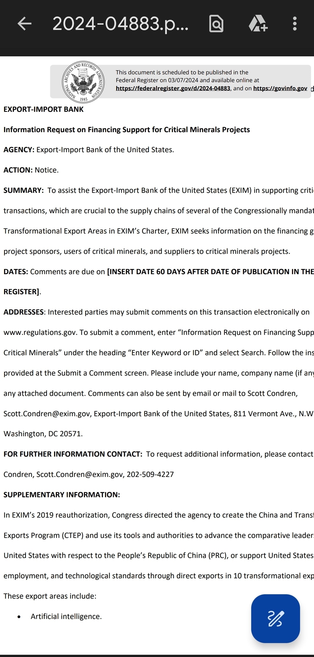 Am Dienstag den 12.03.2024 wird er um 11:00 Uhr sich zu den möglichen Konsequenzen äussern, die es haben könnte, falls das Monopol was China auf Seltene Erden und andere kritische Rohstoffe hat nicht schnellstmöglich gemindert wird und die Verantwortlichen der US Regierung zusammen mit privaten Minenbetreiber nicht umgehend handeln und heimische Lieferketten für kritische Rohstoffe aller Art aufbauen. Ich denke das Thema wird ein wichtiges Thema im Wahlkampf der USA spielen, geht es hier doch um die nationale Sicherheit der USA. Mark Smith spricht auf dem Safe Symposium nach Reta Jo Lewis. Ein weiteres mögliches Anzeichen wie eng Niocorp gerade mit dem Führungsgremium der EXIM Bank in Beziehung steht. Sowie es aussieht wird alles daran gesetzt den wohl seit ca. zwei Jahre in Vorbereitung befindlichen Deal über den Kreditvertrag mit der EXIM Bank zu verwirklichen. Jetzt sind die Finanzexperten am Werk und hoffentlich erfahren wir bald weitere Neuigkeiten zum Verlauf.