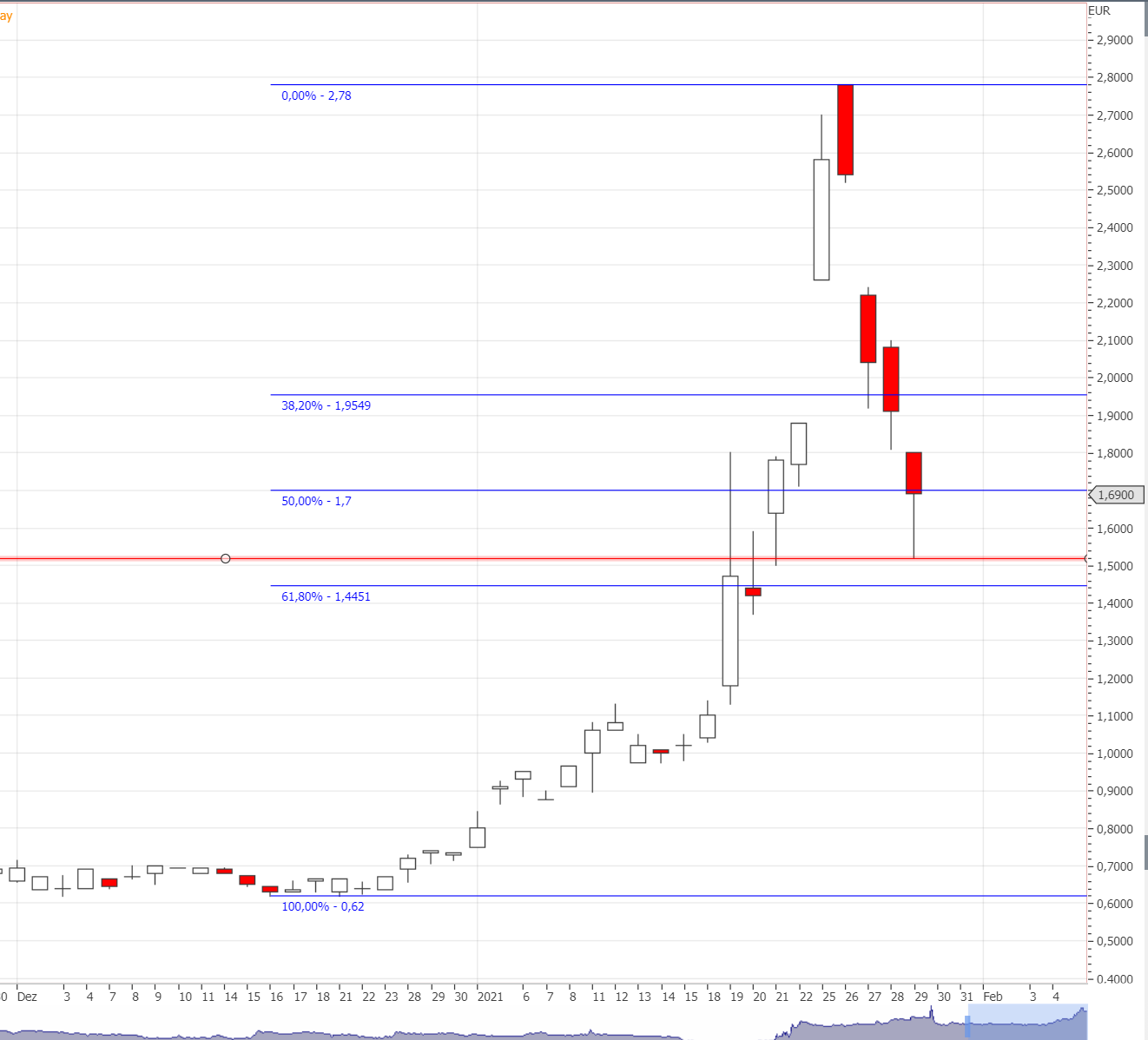 Leider haben wir kein halbwegs homogenes Spannungsfeld zwischen den drei Handelsmärkten. Da hilft es auch nicht, die Charts übereinander zu legen, was die meisten Systeme ohnehin nicht können. Die Australier haben die Vorhersehbarkeit tüchtig kaputt gemacht. Ohne diesen Störfaktor würde sich aus dem Chart ein möglicher Boden auf 1,3702 € empfehlen; das wäre aber auch schon die Marke, bei der die Aktie zur Fortsetzung des Aufwärtstrends starten könnte; sowas ist aber deutlich zu früh. Daher schätze ich (vorsichtig), dass der Wert im 50er Retrace bleibt.