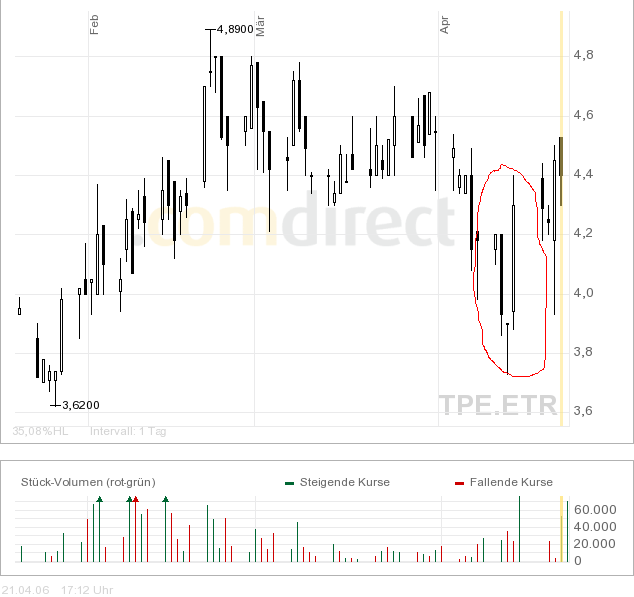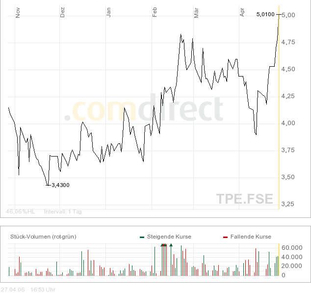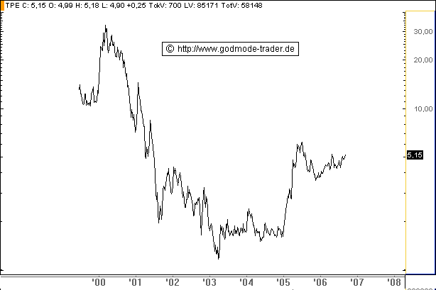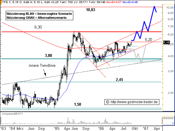 Charttechnischer Ausblick: Steigt die Aktie auf Tages- und Wochenschlussbasis über 5,20 Euro an, wird ein kurzfristiges Kaufsignal mit Ziel bei 6,30 Euro generiert. Steigt sie schließlich signifikant über 6,30 Euro an, wird ein mittelfristiges Kaufsignal mit Zielen bei 10,03 und 15,50 Euro generiert. Nach unten hin sollte jetzt ein Rückfall unter 4,80 Euro vermieden werden, um nochmals Abgaben bis 4,40 - 4,45 Euro zu verhindern. Fällt die Aktie unter den Aufwärtstrend seit November 2005 bei aktuell 4,40 Euro zurück, wird ein kurzfristiges Verkaufsignal mit Ziel bei 3,45 - 3,80 Euro ausgelöst. Mittelfristig wäre erst ein signifikanter Rückfall unter die innere Trendlinie (aktuell 3,45 Euro) der charttechnische K.O. Schlag.