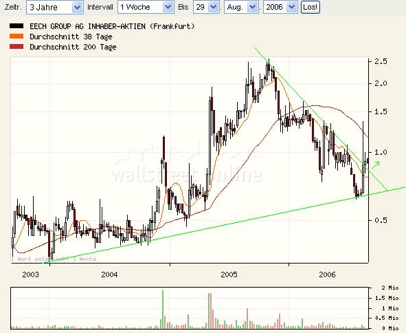 Hamburg, 15. August 2006. Die EECH GROUP AG (ISIN: DE0006852809), Hamburg, hat nach vorläufigen Geschäftszahlen im ersten Halbjahr 2006 einen Konzernüberschuss nach IFRS in Höhe von Euro 3,2 Mio. erzielt (im Vorjahr: Fehlbetrag in Höhe von Euro 2,7 Mio.). Bezüglich der endgültigen Zahlen wird auf den Halbjahresbericht verwiesen, der Ende August 2006 veröffentlicht wird.