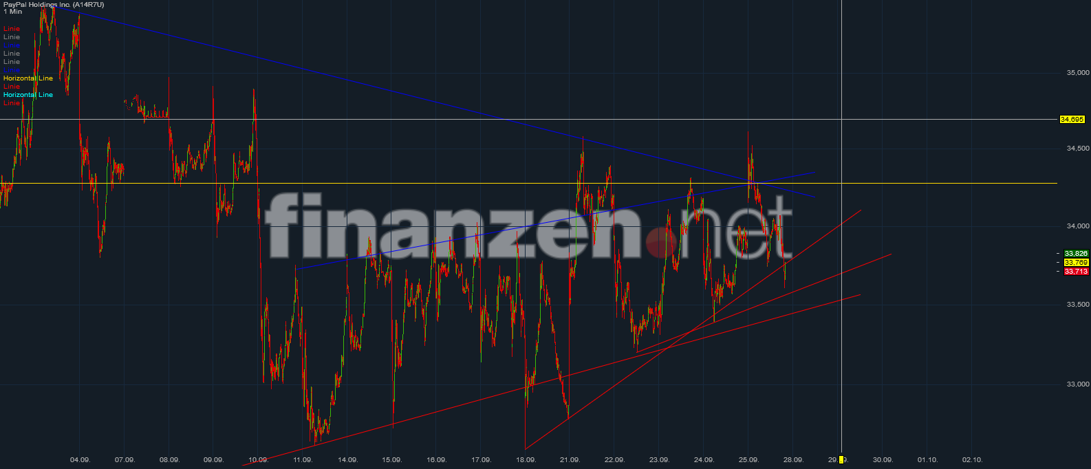 kann man nie genaue Punkte bestimmen, da der Markt eben doch immer etwas unberechenbar bleibt. Deswegen schneiden sich hin und wieder Linien mit dem Chart. Die Vola sieht man bei Paypal natürlich ganz klar, hier reagiert der Markt oft zu schnell und zu heftig auf bestimmte Tendenzen. Dennoch bin ich zuversichtlich, dass wir am Montag auf die 34,9$ gehen und somit die 34$ Basis ausgebaut haben. Der nächste Widerstand liegt dann bei 35,5$, das schätze ich aber erst Mitte nächster WOche ein. Im Moment erkennt man noch nichts durch die 34,28$ - Grenze :/..