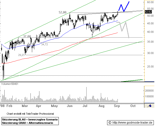 Dieses Allzeithoch hatte die Aktie am 02.06.2008 markierte. Danach setzte eine volatile Seitwärtsbewegung, die als inverse SKS, die hier als Fortsetzungsformation auftritt interpretiert werden kann. Die Nackenlinie verläuft heute minimal über 52,00 Euro.
