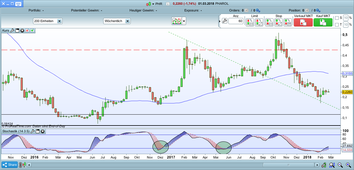 Derweil wabert der Kurs so vor sich hin, hinsichtlich der Marktkorrektur gar nicht mal so schlecht. Der Indikator im Wochenchart zeigt eine mögliche Wende an. Aber auch hier bestimmen die Nachrichten die Bewegung und nicht anders herum.