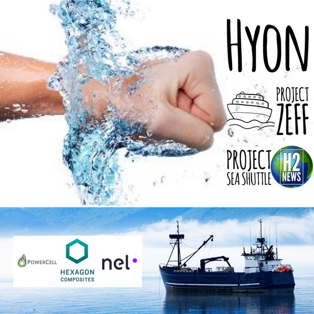 Projekt Sea Shuttle OSLO: 21. Dezember 2018. Hyon, ein Brennstoffzellen-Joint Venture von Hexagon Composites, Nel und PowerCell Sweden, erhielt Zuschüsse für die Entwicklung und Produktion einer Hochgeschwindigkeitsfähre und eines mit Wasserstoff betriebenen Kurzstreckenfrachters. Die Finanzierung wird durch ein PILOT-E-Programm bereitgestellt, das vom norwegischen Forschungsrat, Innovation Norway und Enova eingerichtet wurde. "Project ZEFF", eine Zero-Emission-Schnellfähre für bis zu 300 Passagiere, wird mit Wasserstoff und Batterien mit einer Reisegeschwindigkeit von 25 bis 45 Knoten mit Tragflügelbooten angetrieben. "Project SeaShuttle" wird ein emissionsfreies Kurzstrecken-Containerschiff mit automatisiertem Frachtumschlag und mit Wasserstoff- und Brennstoffzellenantrieb sein.