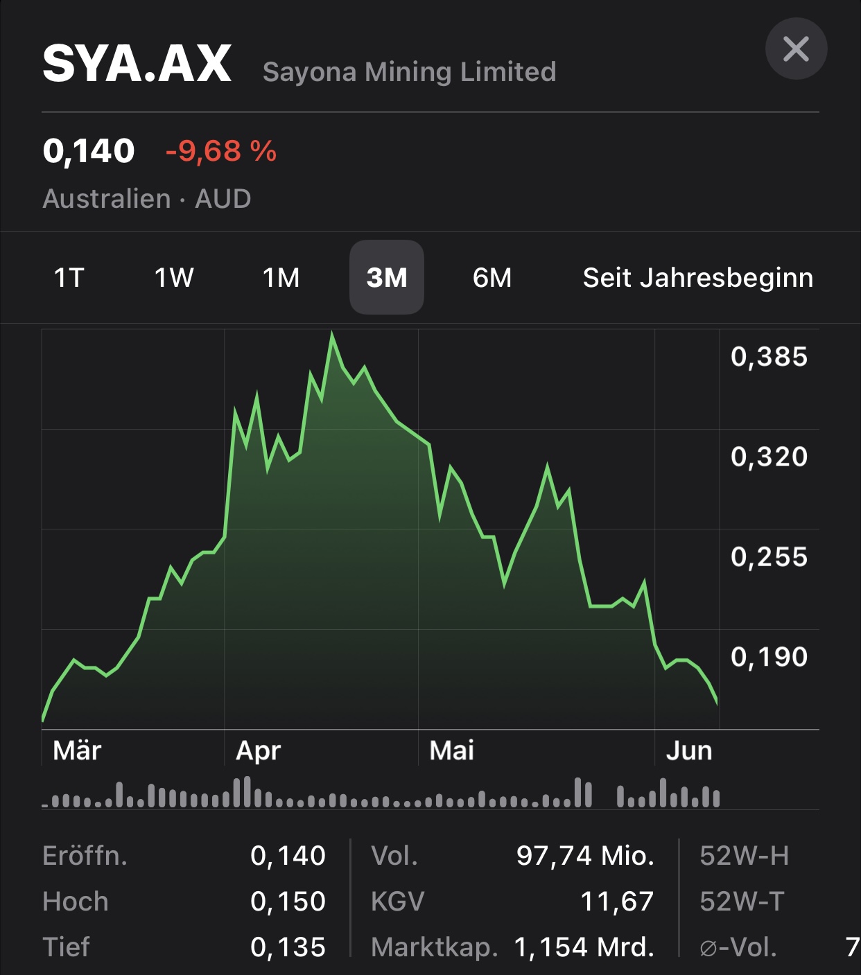SYA veröffentlichte heute früh die offizielle Beschlußfassung zur Wiederinbetriebnahme von NAL in Q1/23. War der Kurs zuvor schon um mehr als 10% gestiegen, sorgte diese Mitteilung für einen weiteren Schub und einen Schlußkurs von -,175AUD (= +25%)