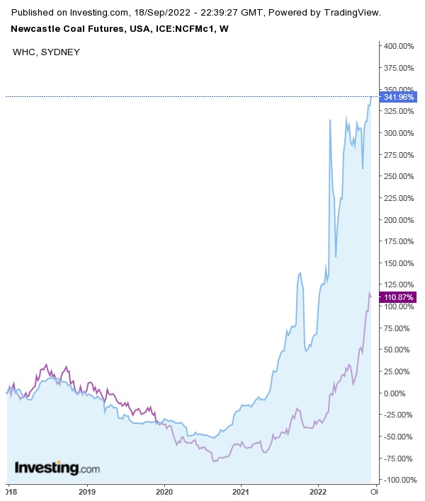 Man kann nicht behaupten, dass der Kurs von Whitehaven den Anstieg der Kohlepreise nachvollzogen hat.