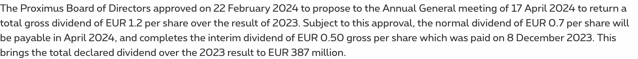 In line with the bold2025 strategy and deriving shareholder return policy, Proximus intends to return over the result of 2023 a stable gross dividend of EUR 1.20 per share, provided a financial performance delivery in line with its strategic plan.