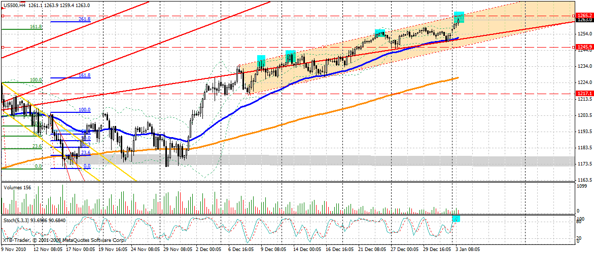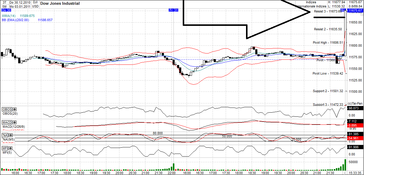 Fazit: Größere Handelsignale entstehen im SP F jedoch erst bei Ausbruch oder Bruch dieses Aufwärtstrendkanals. Ein Ausbruch verschärft wieder die aktuelle Rally, was ich mir bei der zurückgelegten Rallystrecke in 2010 nicht wirklich vorstellen kann. Aber sollte es so sein, der Markt hat ja bekanntlich recht.