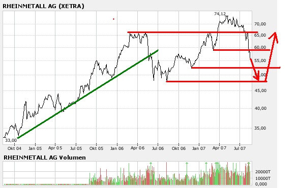Rückblick: Die RHEINMETALL - Aktie befindet sich in einer langfristigen Aufwärtsbewegung. Im Mai 2006 markierte sie ein Hoch bei 67,12 Euro. Dieses überwand sie Ende März 2007 und zog danach auf 76,82 Euro an. Nach einem Rückfall auf 67,12 Euro pendelte die Aktie zunächst seitwärts oberhalb des 2006er Hochs. Mitte Juli fiel sie aber darunter zurück. Zudem durchbrach sie in der vorletzten Woche auch noch den Aufwärtstrend ab August 2006. Die Aktie fiel auf 50,60 Euro zurück. In der laufenden Woche erholt sich der Wert wieder.