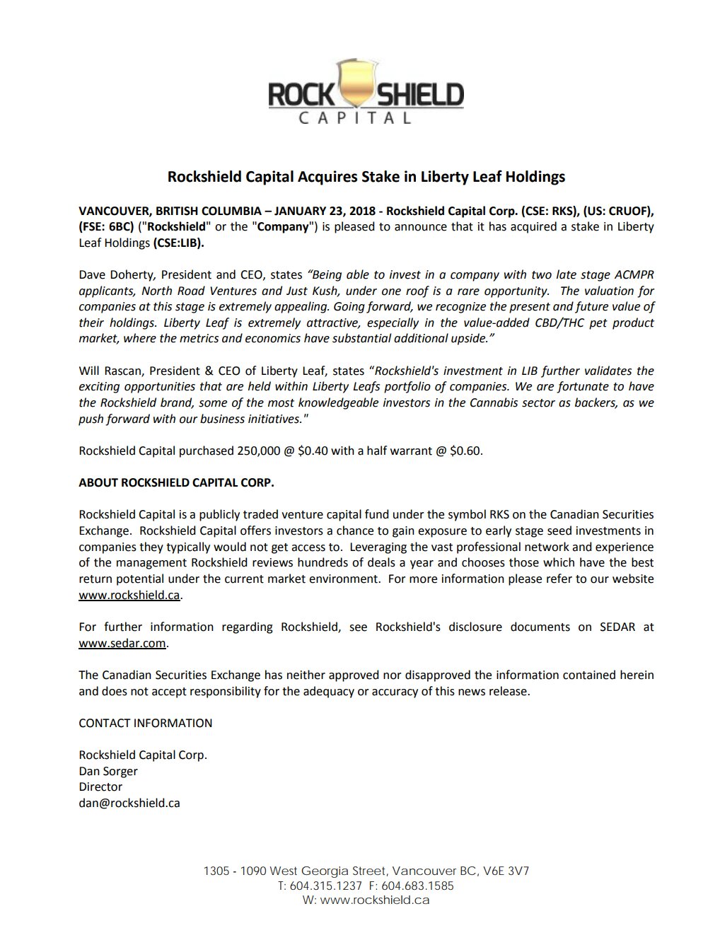 Für weitere Informationen: Rockshield Capital Corp., David Doherty, Präsident und CEO, dave@rockshield.ca; Dan Sorger, Direktor, dan@rockshield.ca