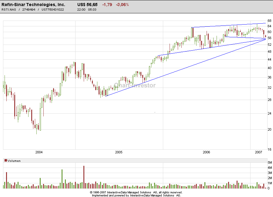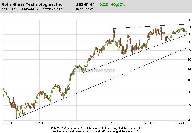Seit Mitte 2004 befinden sich die Aktien von Rofin Sinar wieder im Aufwärtstrend. Im Mittel stieg der Kurs pro Jahr um rund 37 % an. Dabei kristallisierte sich ein klarer Aufwärtstrendkanal heraus, dessen obere Begrenzungslinie nach der dynamischen Kurs-Rallye von 18 bis 50 Euro im Mai 2006 erreicht wurde. Im Anschluss an die darauf folgende Konsolidierung stieg der Kurs zuerst verhalten am unteren Ende des Trendkanals an, konnte sich aber mittlerweile über das Niveau von 50 Euro auf 55 Euro verteuern. In den letzten Stunden gelang den Notierungen ein Ausbruch über das diesjährige Hoch von knapp 55,50 Euro.