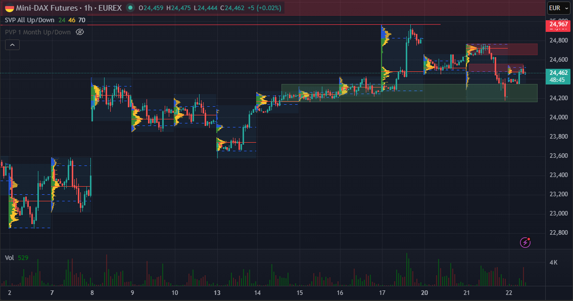 Die kleine grüne Range wurde direkt nach unten durchbrochen, auch in den kleineren Einheiten sah ich kein Setup für long. Im grösseren grünen Bereich hat er vorerst eine kleine Gegenreaktion gezeigt und hat dann an der unteren Kante aufgesetzt. Seit dem Top vom Freitag haben wir nun zwei grössere Abwärtsbewegungen, dazwischen eine breitere Erholung. Somit auf dieser Ebene einen Abwärtstrend etabliert. Der vorgängig grüne Bereich um 24520 wurde zu einem low Volume Bereich, somit jetzt als Resist Zone. Unter dem grünen Beriech gibt es die 2-Tages Range vom 9./10.4. zu beachten.