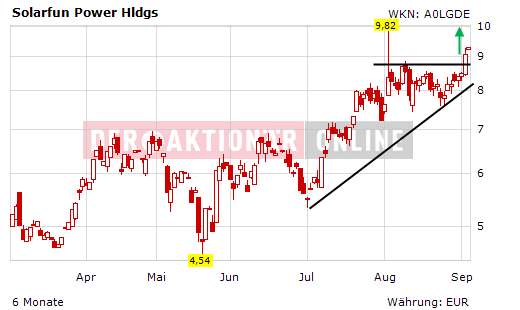 Solarfun ist also gleich in mehrfacher Hinsicht ein aussichtsreiches Investment. Der Aktionär hält an seinem 12-Monats-Kursziel von 16,00 Euro fest, was im Vergleich zum aktuellen Kurs von 9,00 Euro einem Kurspotenzial von 77,8 Prozent entspricht. Zur Absicherung der Position sollte bei 6,40 Euro ein Stopp platziert werden.
