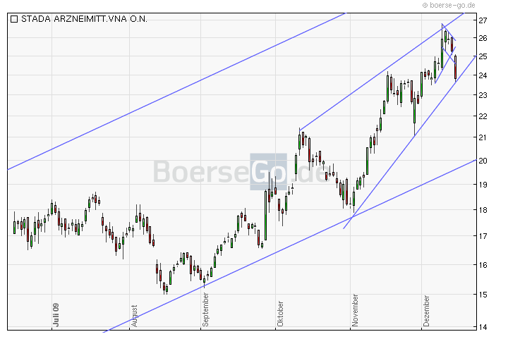 Die Stada Aktie brach vergangene Woche dynamisch aus dem flachen Aufwärtstrendkanal der letzten Monate nach oben hin aus und erreichte ein neues Jahreshoch bei 24,20 Euro. Anschließend startete eine Konsolidierung bis an die gebrochene Trendoberkante, wo sie jetzt deutlich nach oben hin abprallt.